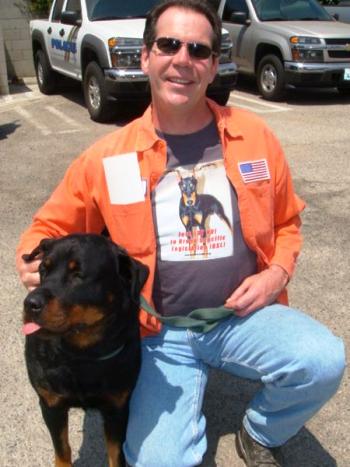 Contest winner Eric wearing T-shirt from REXANO!!! Stop Breed Specific Legislation!!! Photo taken with a dog that was available for adoption at the Burbank Animal Shelter, June 2008.